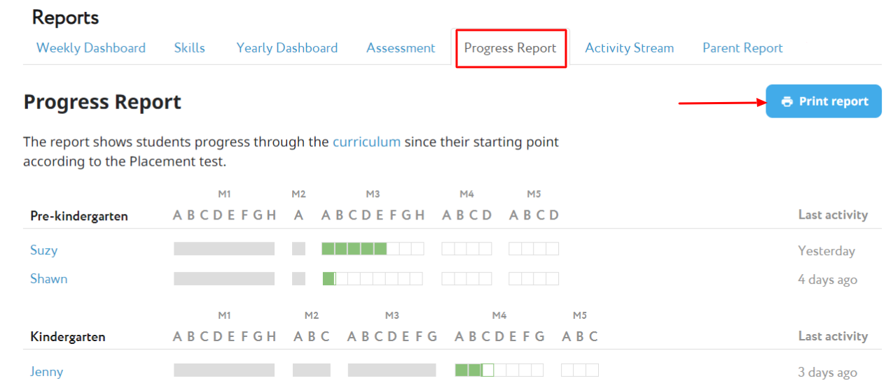 Of course, you can! To print the progress report for the entire class, go to 'Reports' in your teacher account, select 'Progress report' and click the "Print report" button.