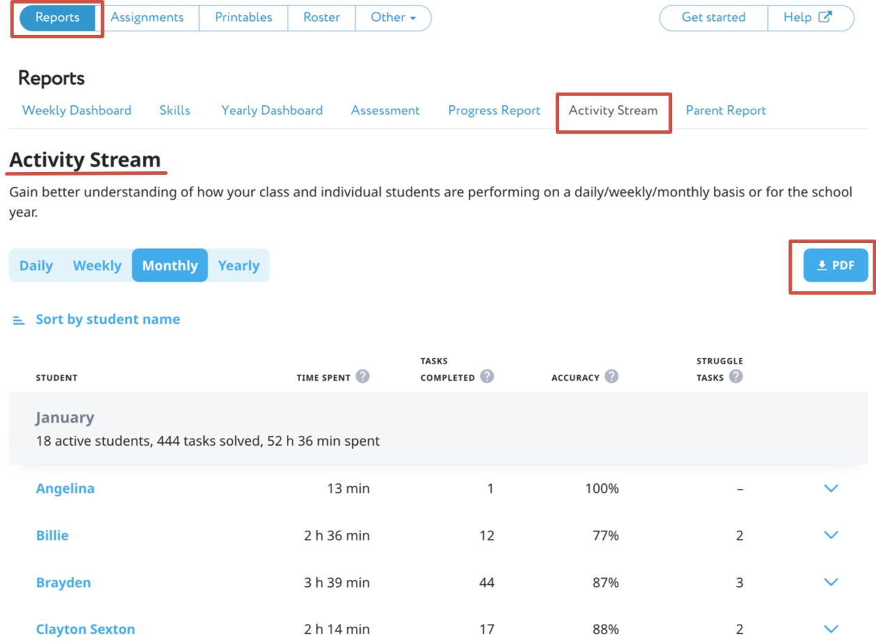 We have you covered if you're looking to print the Activity Stream details like accuracy rate, the number of tasks done, and time spent for the entire class! Go to the 'Activity Stream' section, select the period you'd like to be displayed, and click 'PDF' to download it. You can either share a downloaded PDF via email or print it.