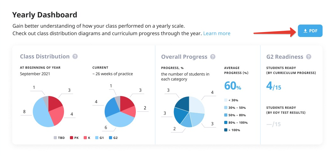 If you'd like to share the information about your class performance and progress yearly, you can click "PDF" to download the Yearly Dashboard.