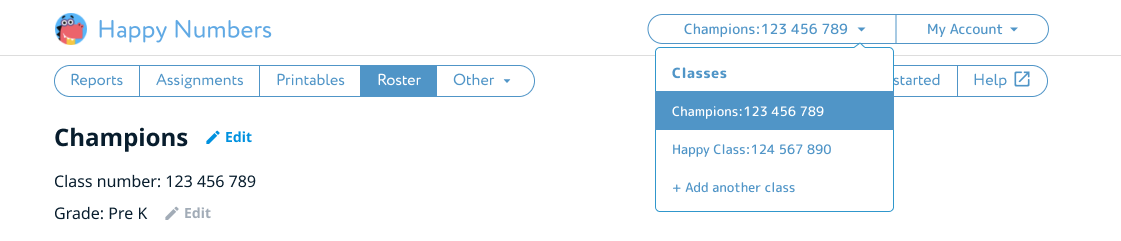 When you are logged into your teacher account, click the arrow near your class number to switch between classes.