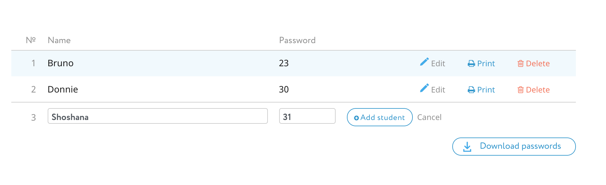When all of your students are added to the class, you can click "Download passwords" to download the students' login credentials and share them along with the Parent letter with their parents.