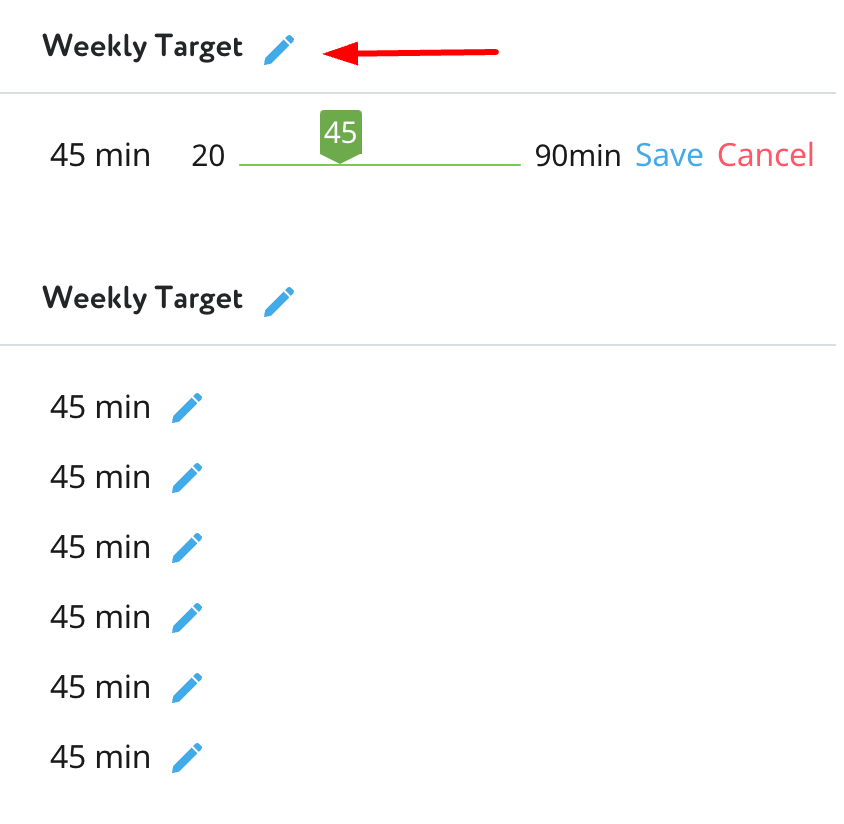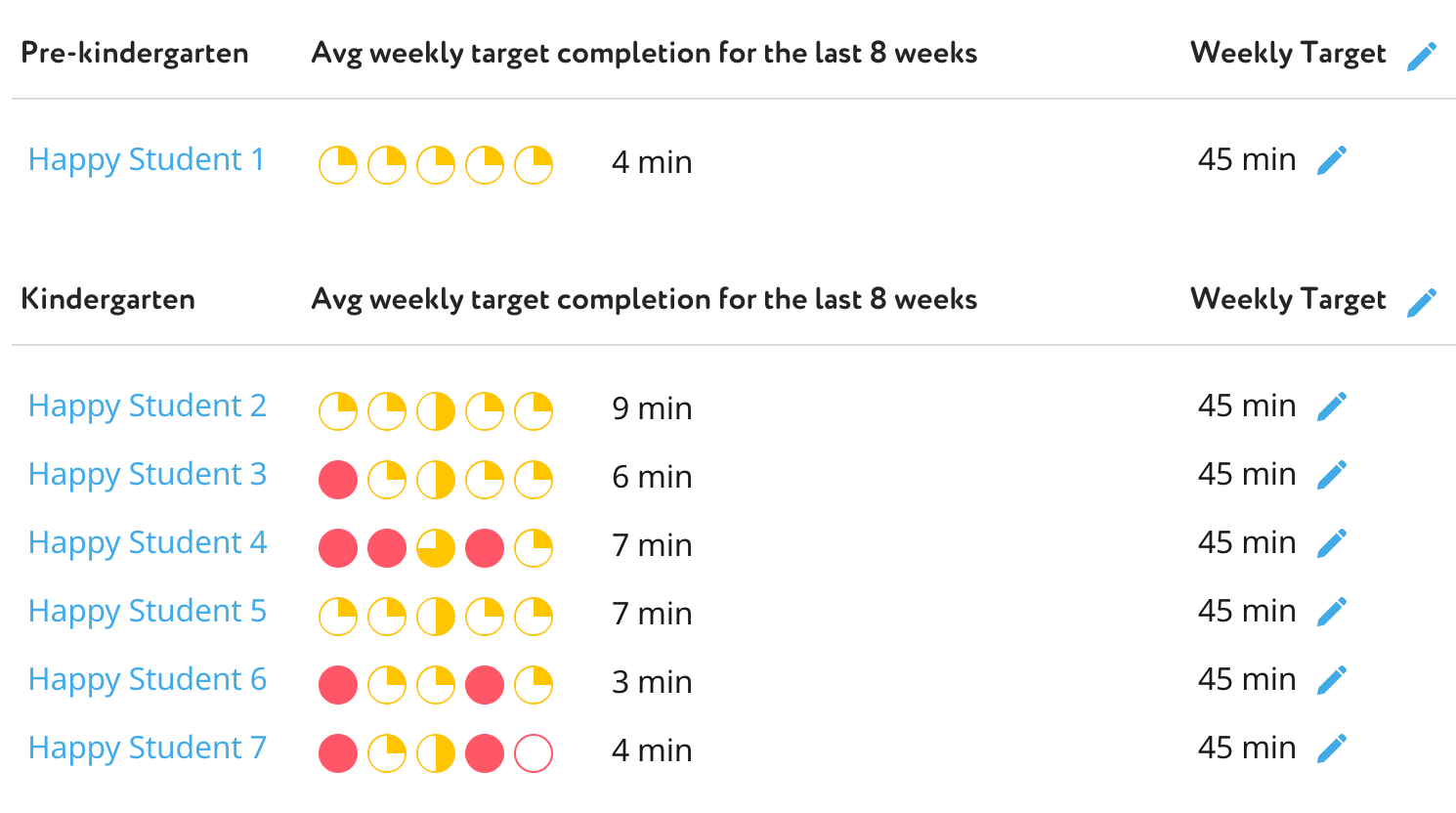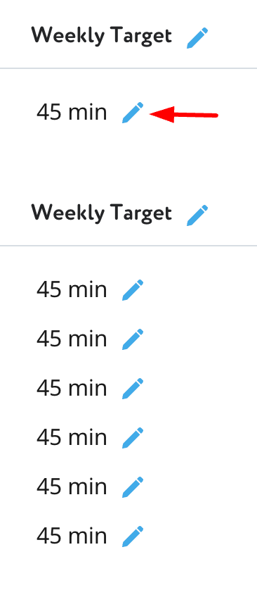The column furthest to the right shows the Weekly Target set for each student. The Weekly Target is assigned by default according to our recommendations, but you can always change it. To make a change for the whole class, choose the pen near the column header.