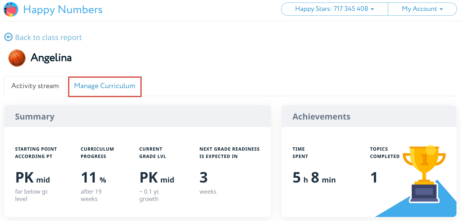 Then switch to the "Assignments" tab where you’ll be able to customize the number of tasks assigned to the student by selecting necessary modules or topics from the Happy Numbers curriculum.