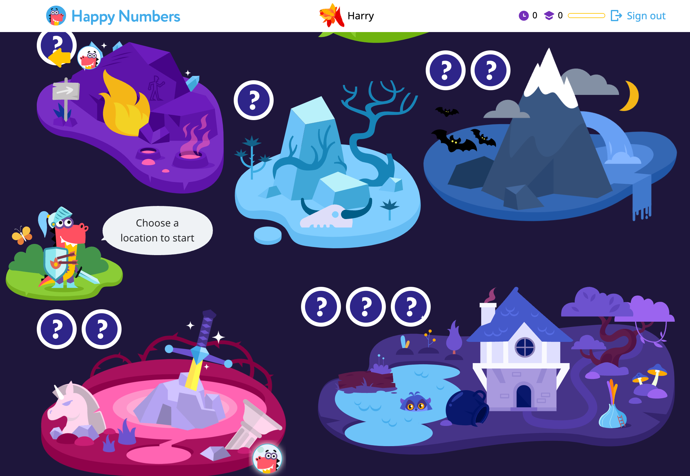 As soon as the Placement Test is completed, students are placed on a map with various locations from which to choose (outer space for PK-K, a Wonder Factory for 1st grade, Magic Story for 2nd grade, or a whole magical world for grades 3-5). Students earn rewards for solving math tasks in each location. Depending on their grade, it could be hatching a baby dinosaur, acquiring a gizmo, or accessing a magic item for their quest. To earn a reward, a student must complete all tasks in that location.