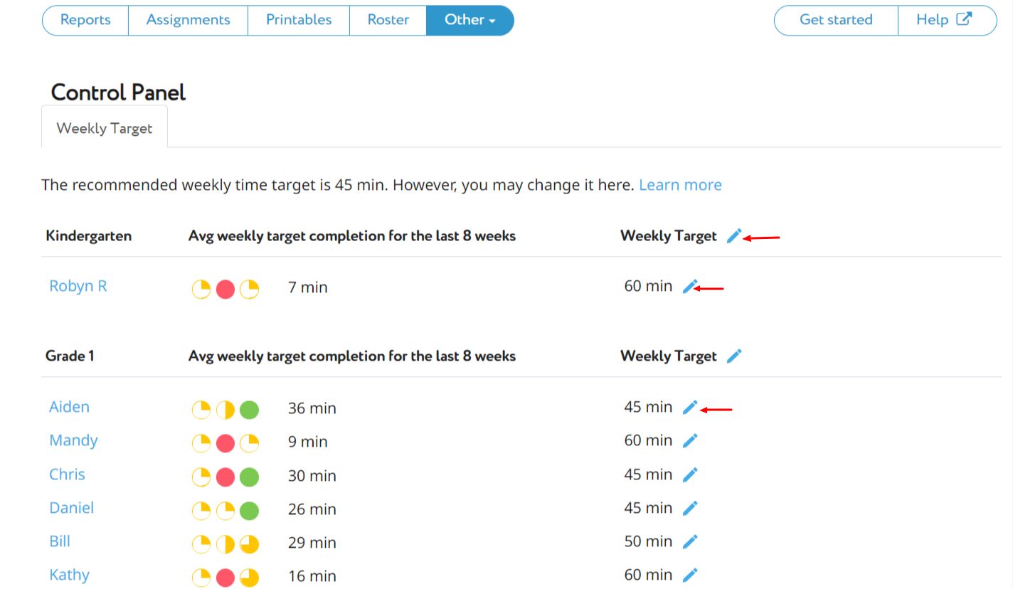 Teachers can adjust the Weekly Target for all students or for individuals. To do so, open the teacher account and go to the Control Panel. Here, the Weekly Target sets the time expected for students to complete the tasks in a location and earn a reward. For example, to require more time for students to level up, increase the Weekly Target to 60 min. This means that an average student will need to spend 60 minutes to complete the tasks in one location and move to another (for example, to open a new room in the Wonder Factory). We strongly recommend setting a Weekly Target that ensures every student will be able to achieve it in a week and earn the reward.
