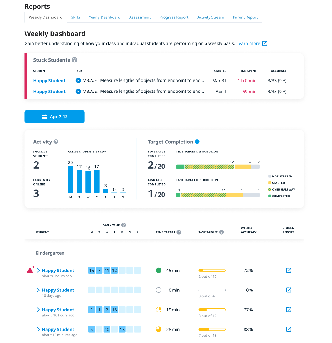 Access to the Weekly Dashboard is limited if you have a Basic Classroom license. To learn more about the differences between license types and what features are available, please visit this page.