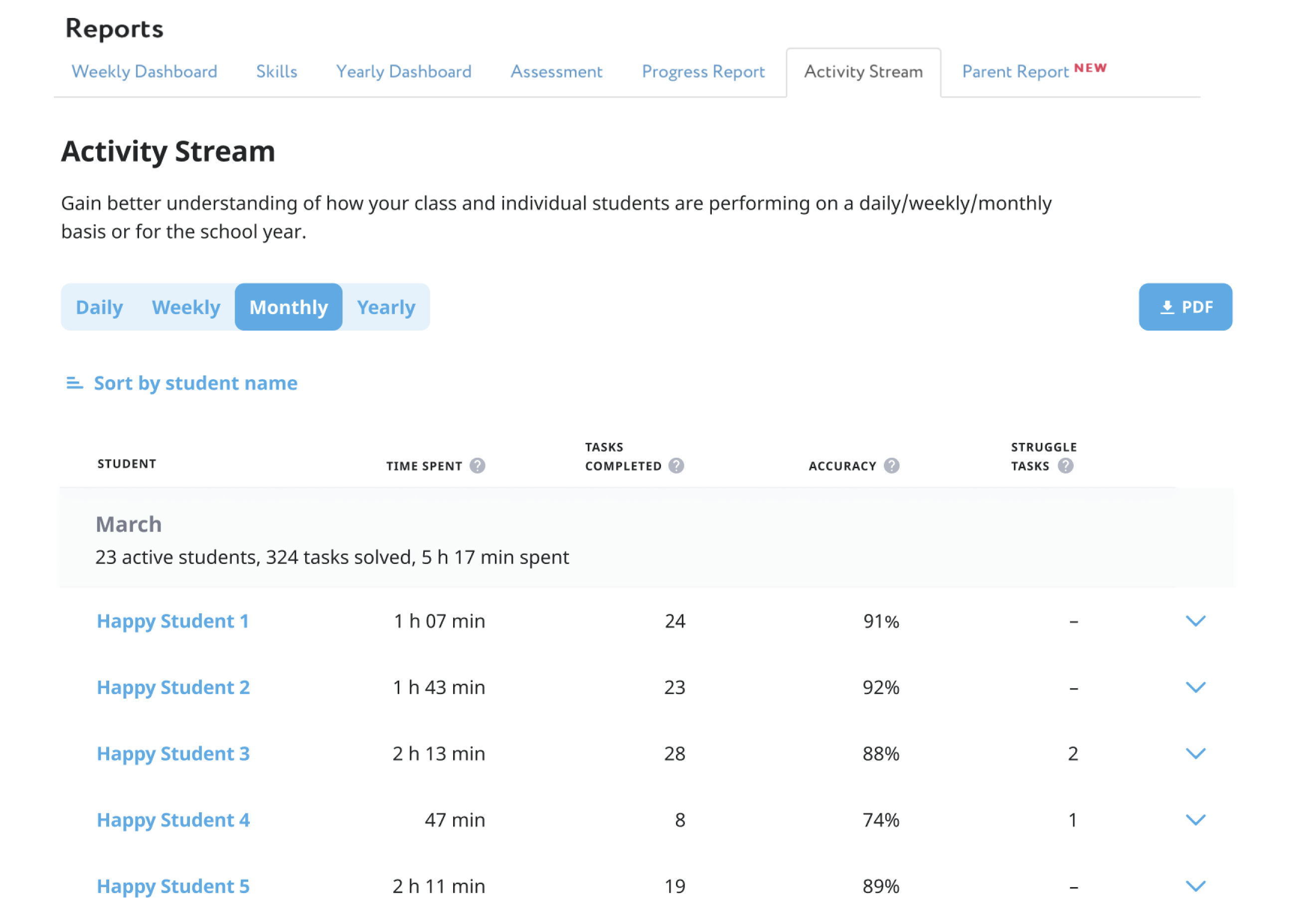 The Activity Stream is a clearly-structured report for teachers to use in assessing student progress, providing feedback to students, or sharing information with parents!