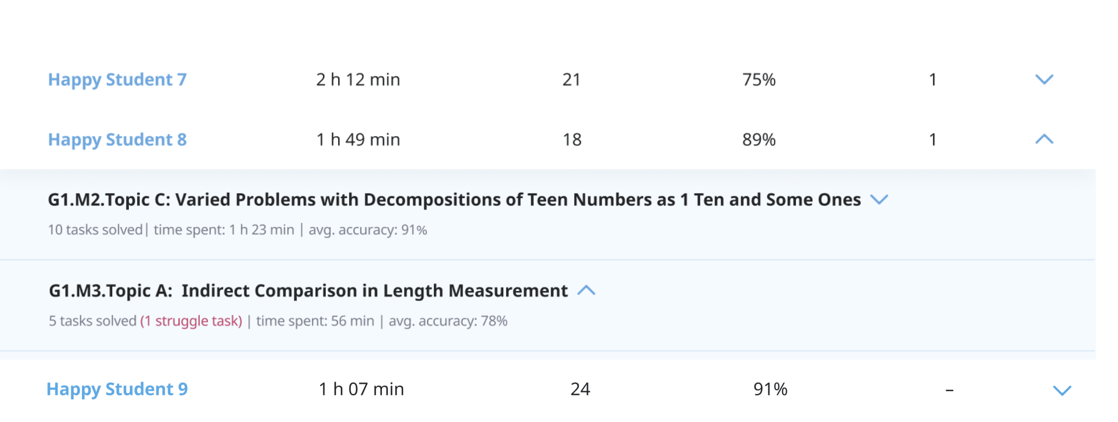 By clicking the “show details” option in the blue bar, you can expand the class report to show data on individual topics and exercises for each student.