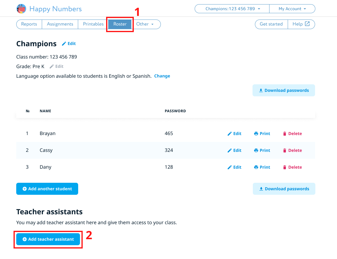 In your teacher account, go to the "Roster" section (1). Below the class roster, you'll find a category for Teacher Assistants. Click "Add teacher assistant" (2).