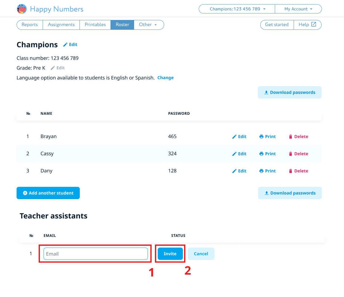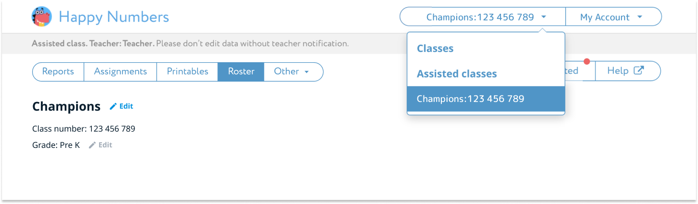 If your teacher assistant already has a Happy Numbers account, they will be able to switch between classes after you send the invitation.