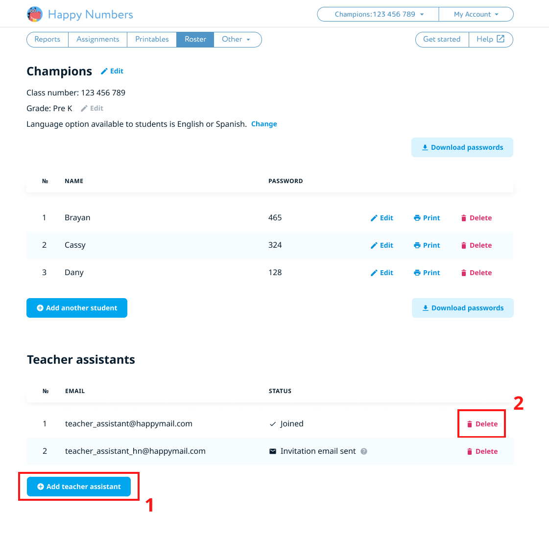 Click “Add teacher assistant” (1) to send a new invitation or “Delete” (2) to remove an assistant from your class.