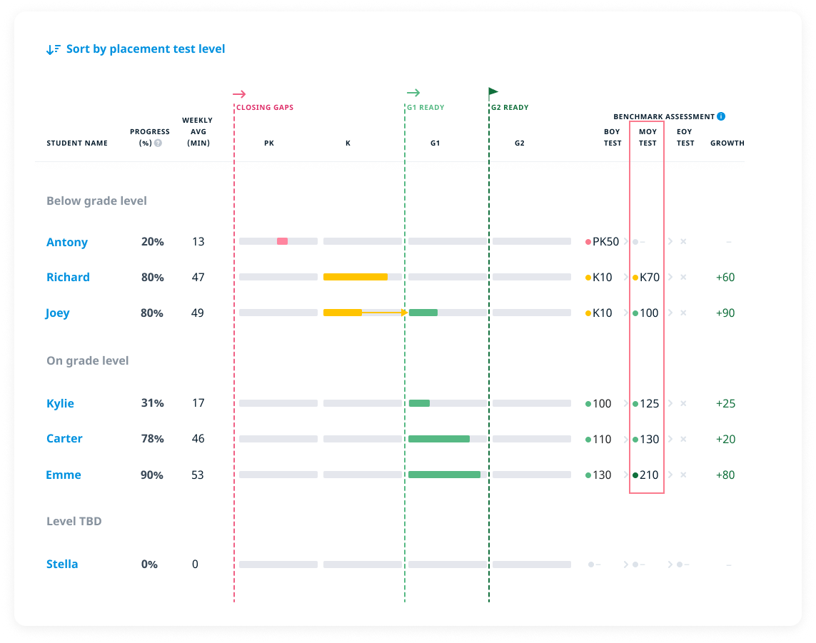 Without access to exact HN Scores from the BOY and MOY assessments, Basic Classroom users have limited tools for evaluating student growth. However, you can still make informed judgments based on color-coded results and placement change indicators in the dashboard.