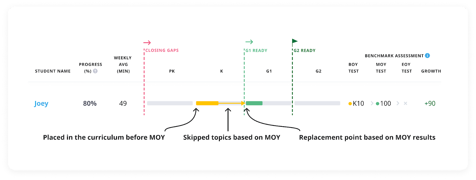 However, it is important to note that we do not place students more than 1.5 grades higher than their current curriculum point or beyond the middle of their grade. You can check how a student's score aligns with our curriculum here.