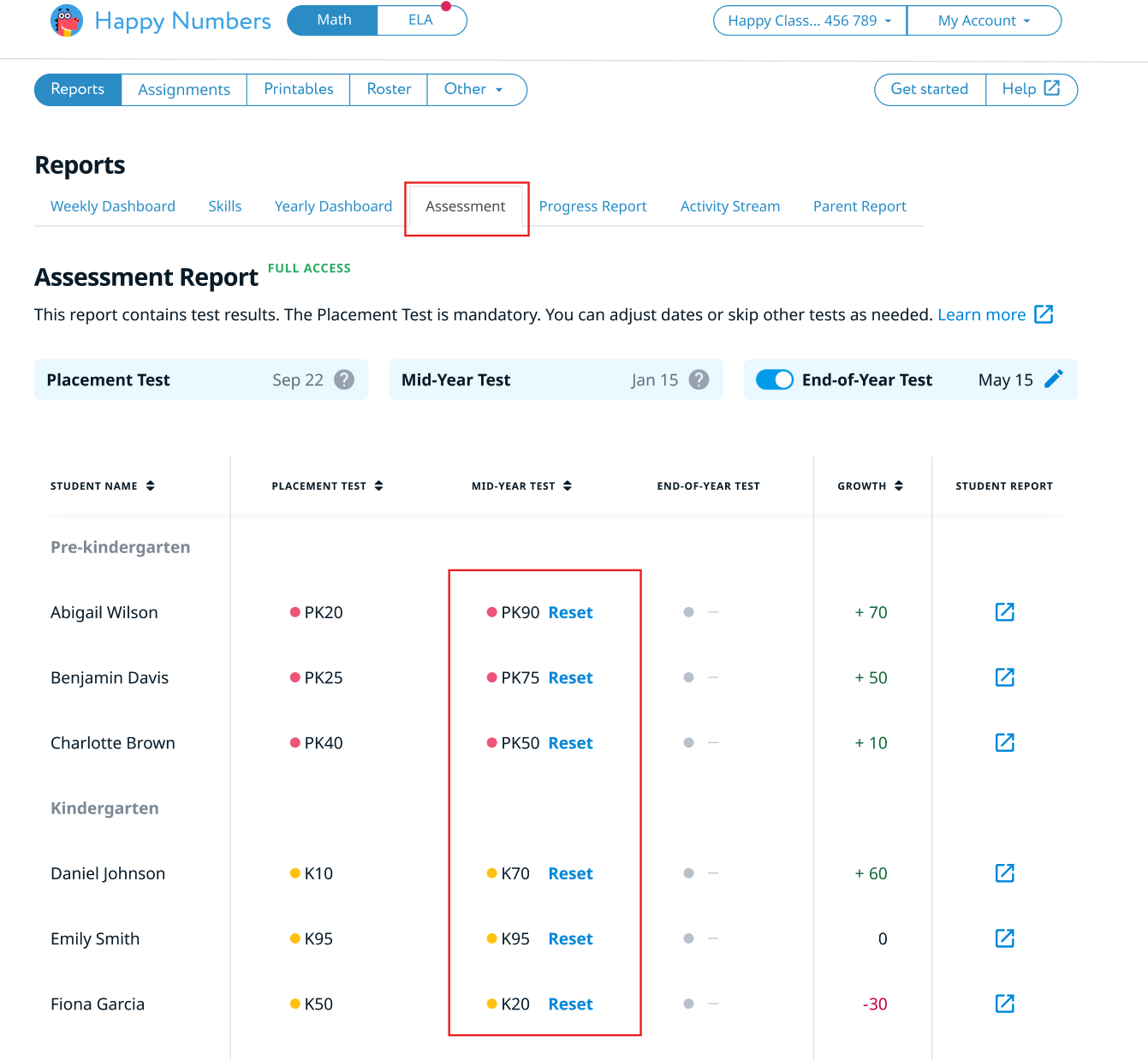 You will still see color-coded results represented as dots in different colors — these help you monitor student performance and understand their placement in the Happy Numbers curriculum. For more details on interpreting these results, please see below.