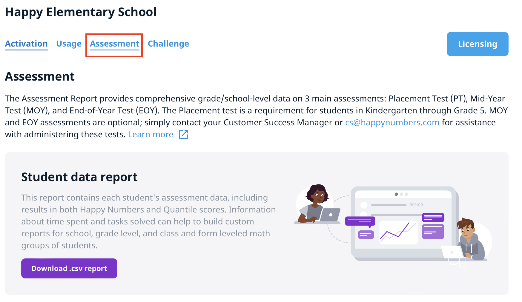 The School Assessment Report and dedicated Customer Success Manager support are available only with School and District licenses. To learn more about the differences between license types and what features are available, please visit this page.