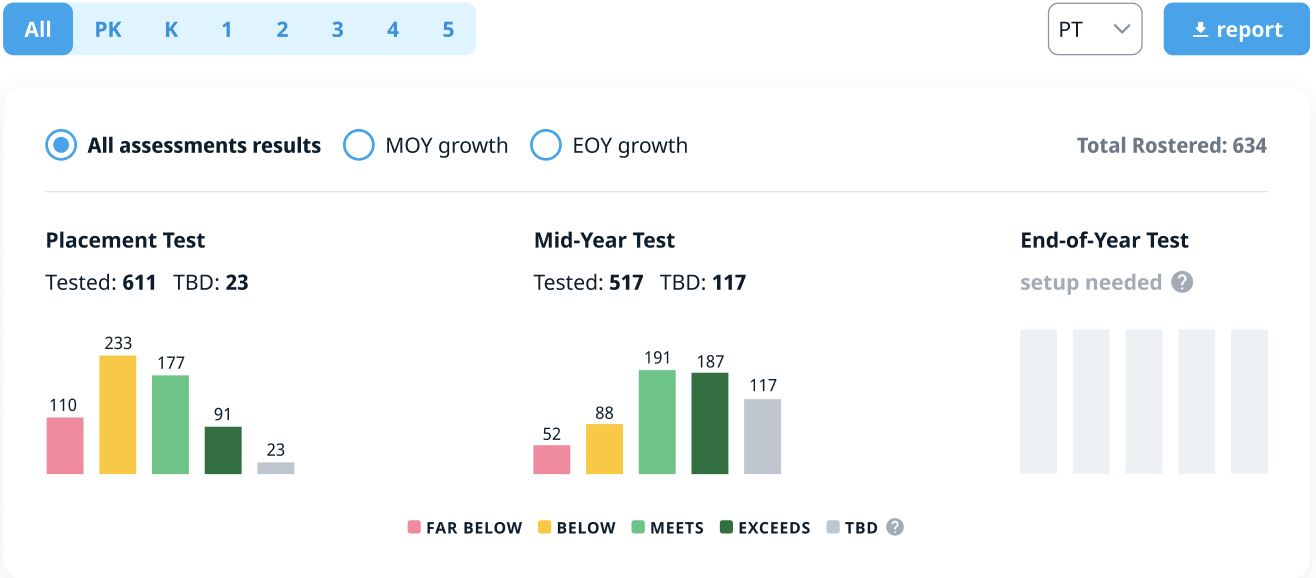 All Assessments Results: This is the default option, showing an overall picture of student performance at three key points in the academic year: the beginning (PT), middle (MOY), and end (EOY). Each point is represented by a bar chart displaying the results independently.