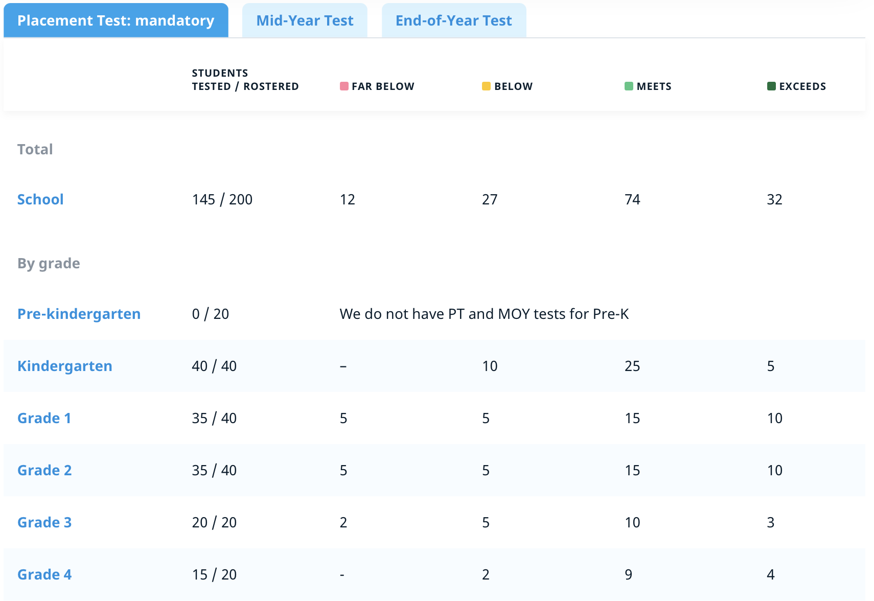The section below provides admins with detailed data on how the assessment results are distributed in each grade level.