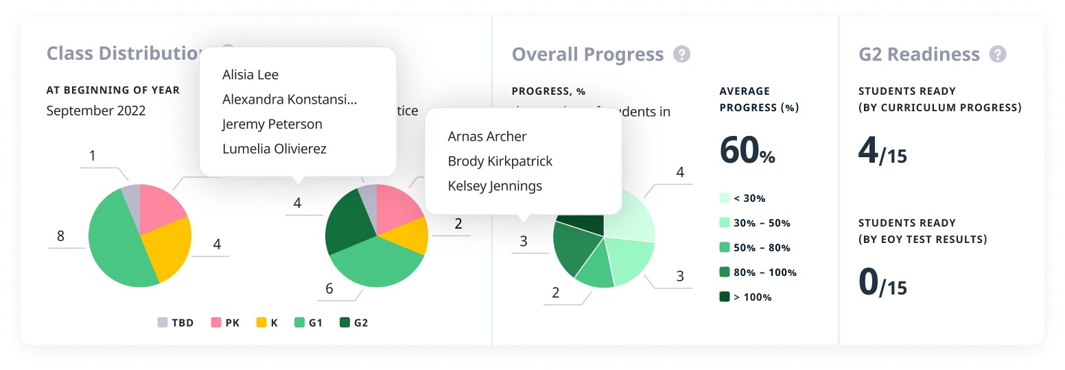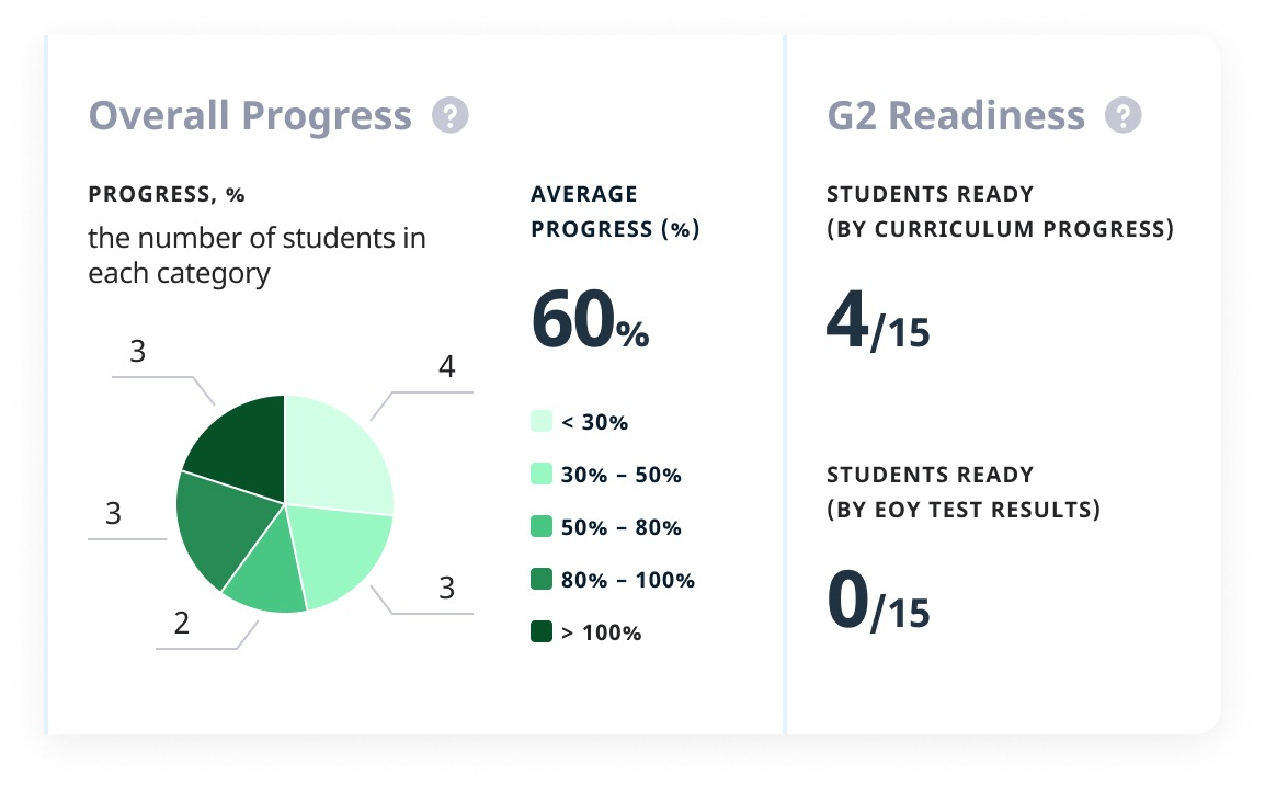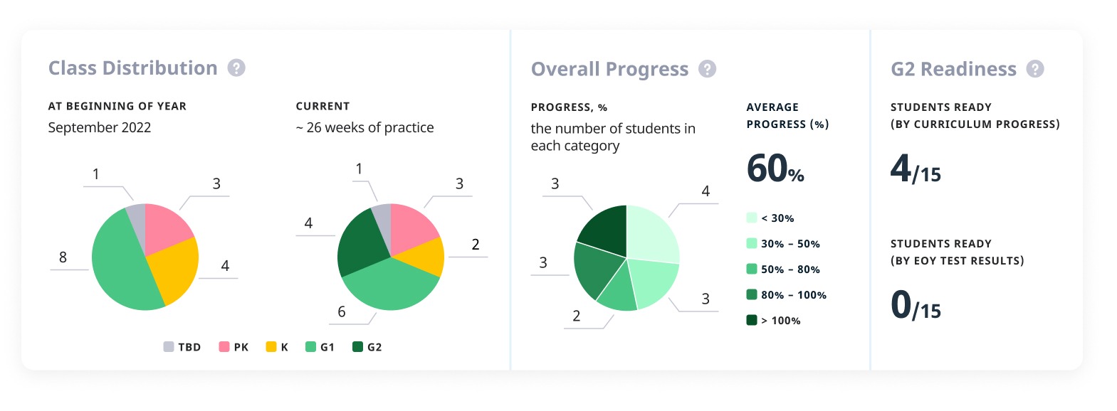 This section shows the number of students ready for the next grade based on the curriculum progress made and EOY test results. For example, your students might be not advancing too much within the curriculum, though they might be ready for the next grade based on the test results, and vice versa.