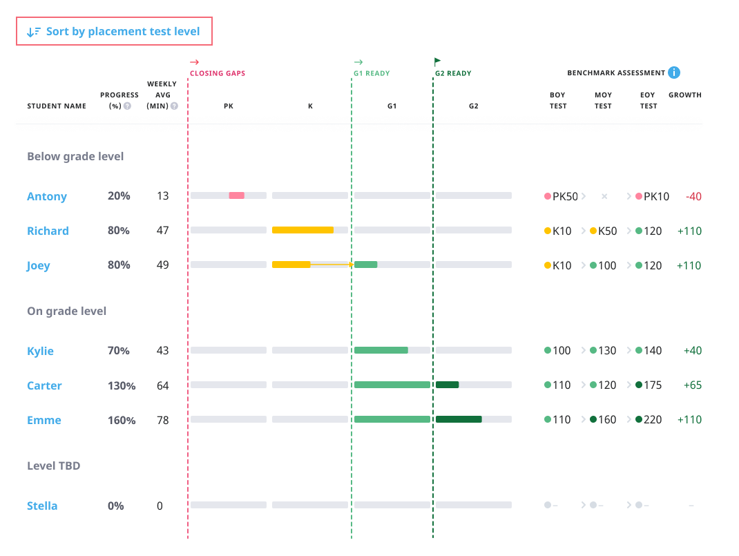 Placement Test (default sorting indicator). There are three PT level types: below grade, on grade, TBD (test not taken yet)
