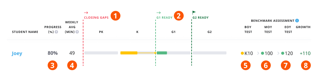 The progress made is compared to the Placement Test results. Joey’s yearly growth score is +110, which comes from K10 at the beginning of the year compared to 120 at the end of the year.