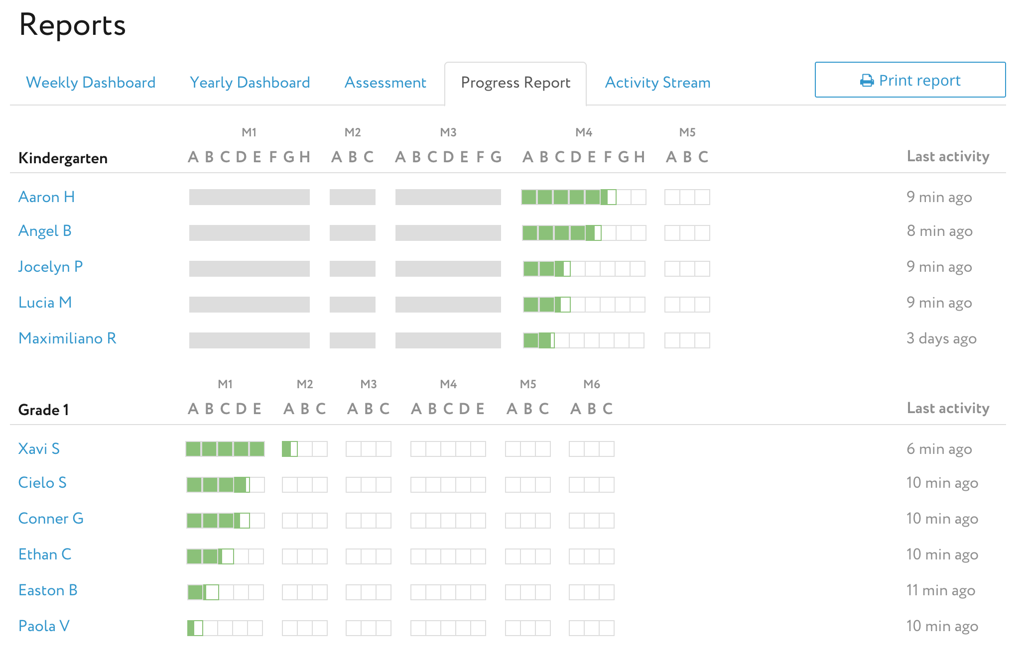 The Progress Report includes more detailed information on each student’s learning pathway: starting point, modules, completed topics, and topic in process.