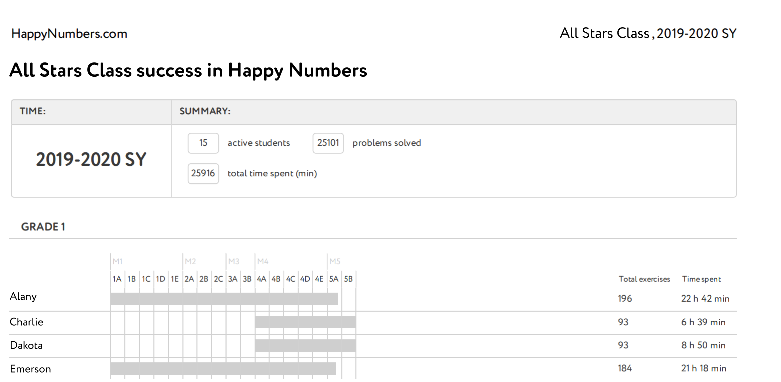1) Summary: the number of active students (those who have finished the Placement Test and started exercises), how many problems your class solved, and total time spent;
