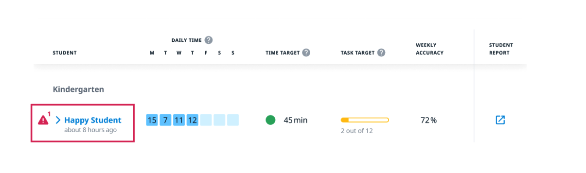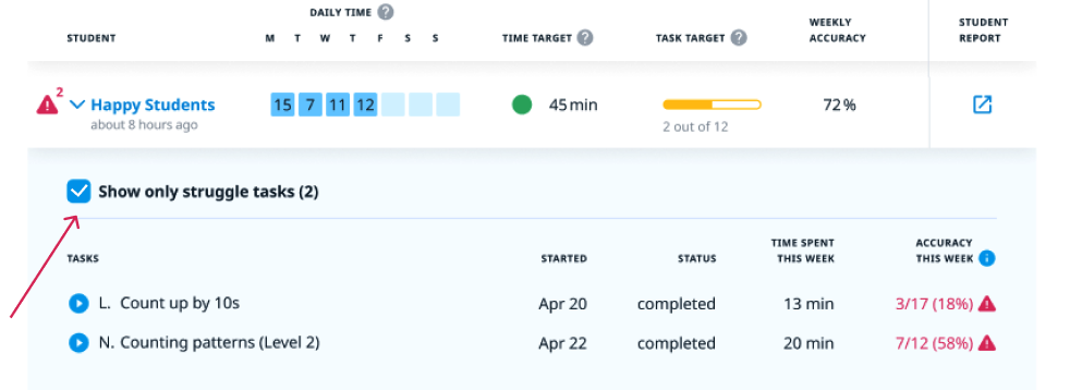 Have you ever wondered where exactly on Happy Numbers your students struggle? Have you ever noticed the red alert mark that sometimes appears on the Weekly Dashboard next to students' names? This alert means that a student has struggled with accuracy in one or more tasks this week.