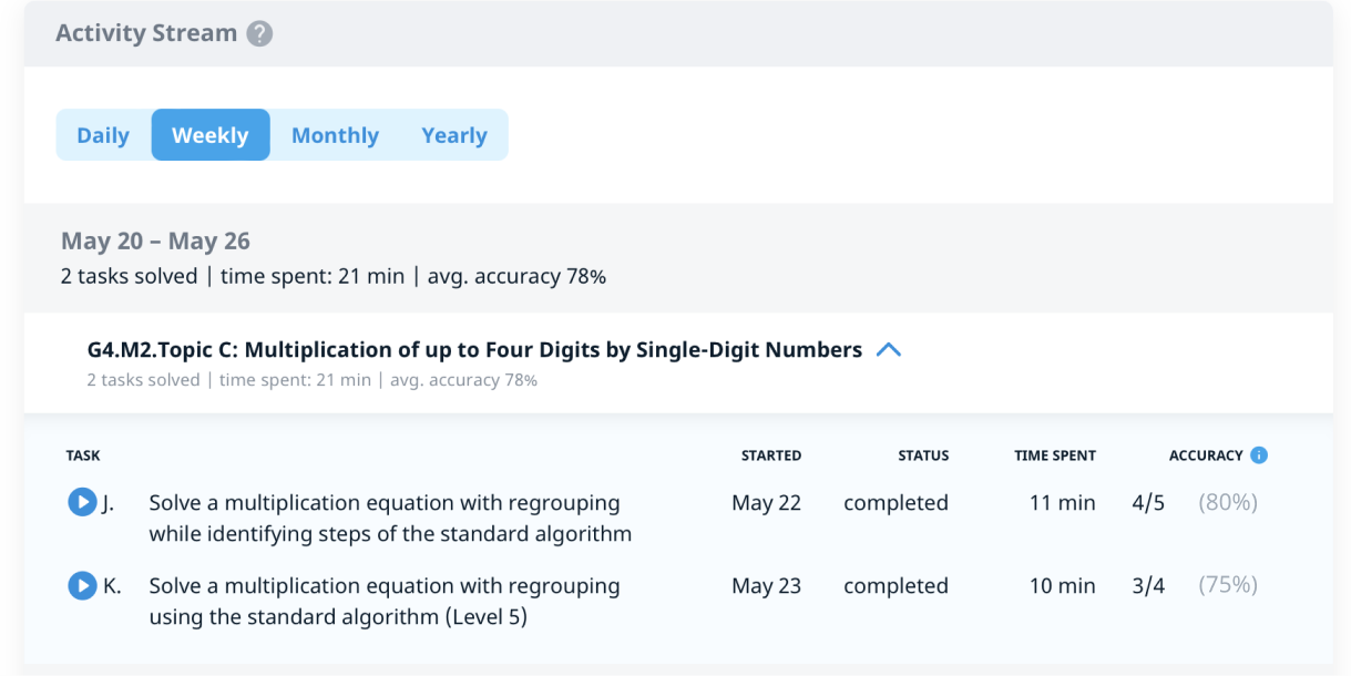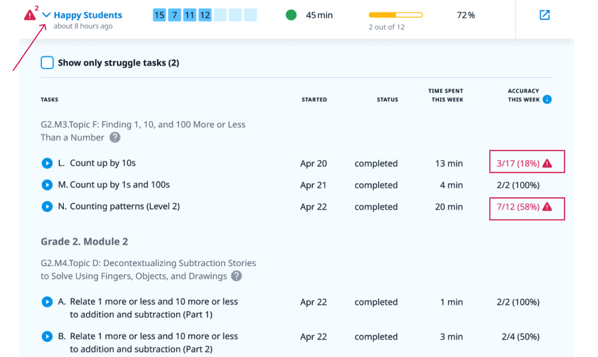 Sometimes, a low accuracy rate doesn't mean that a student has gaps in understanding. If he solves 1 out of 2 problems correctly (an accuracy rate of 50%), a simple typo could be the reason. However, if he solves 4 out of 8 problems correctly, the same accuracy rate of 50% is more problematic. That's why our methodologists have developed a unique algorithm to highlight only tasks where the number of mistakes is significant. If you want to know how many problems were solved correctly, click on the student's name and find this task in the Activity Stream.