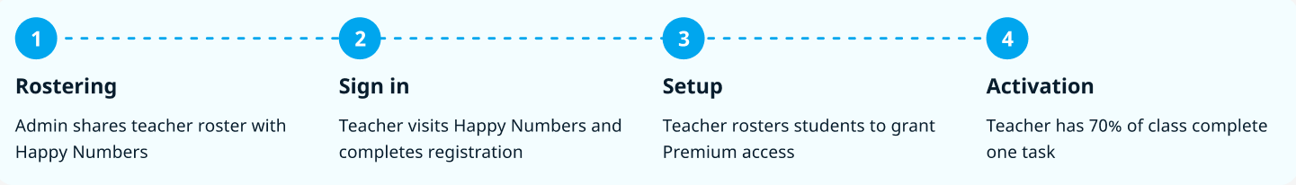 Teacher Activation is a 4-step process that starts when a teacher receives an invitation to Happy Numbers and logs into their account. It continues through the student Placement Test and is complete when students begin learning with Happy Numbers. The report shows admins the step of the activation process a teacher is currently on, so admins can assist them or encourage them to use their Premium access.