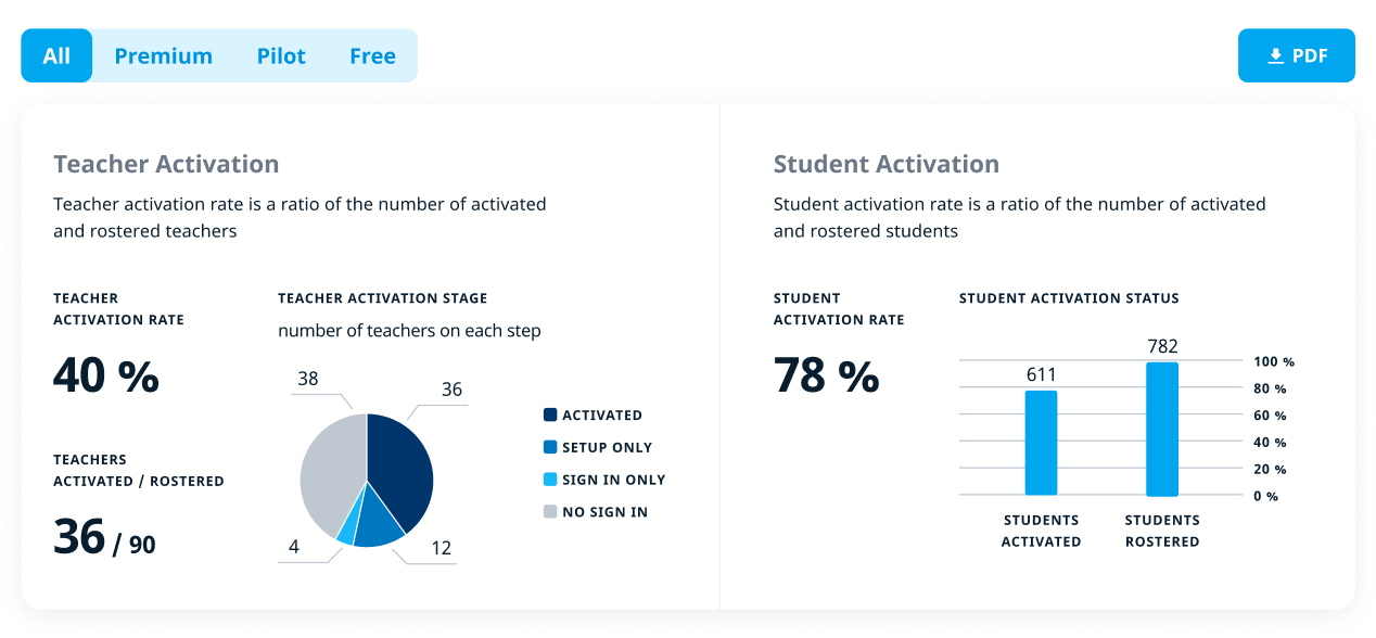 The student activation section shows an overall student activation rate based on the number of rostered students and the number of activated students. An activated student is one who completed the Placement Test and solved at least 1 task in the curriculum. Since there is no Placement Test in PreK, these students only need to solve 1 task from the beginning of the curriculum to complete activation.