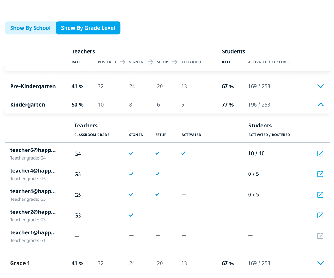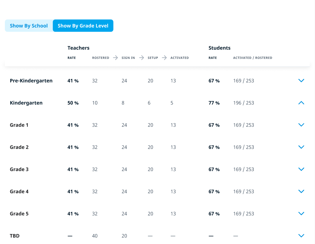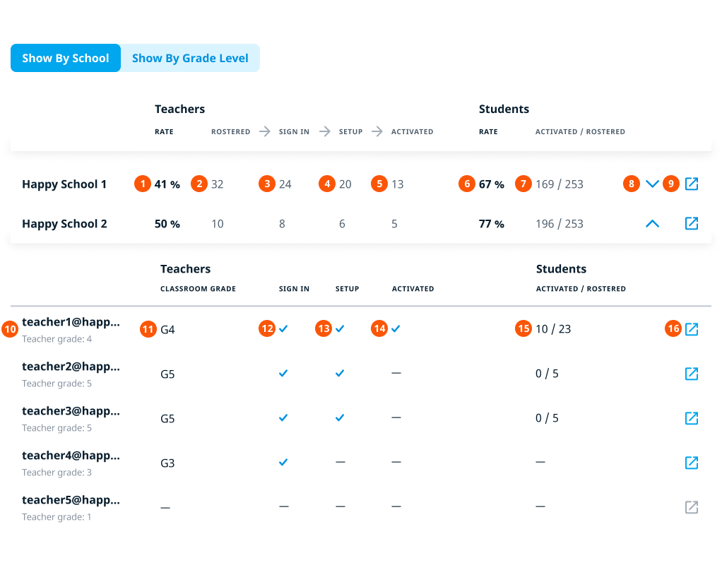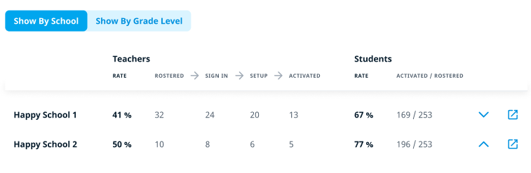 Activation is an essential step in your district’s onboarding. That’s why keeping track of the activation rates is important to ensure successful implementation of Happy Numbers. This report displays teacher and student progress toward activation in all schools in your district that use Happy Numbers.