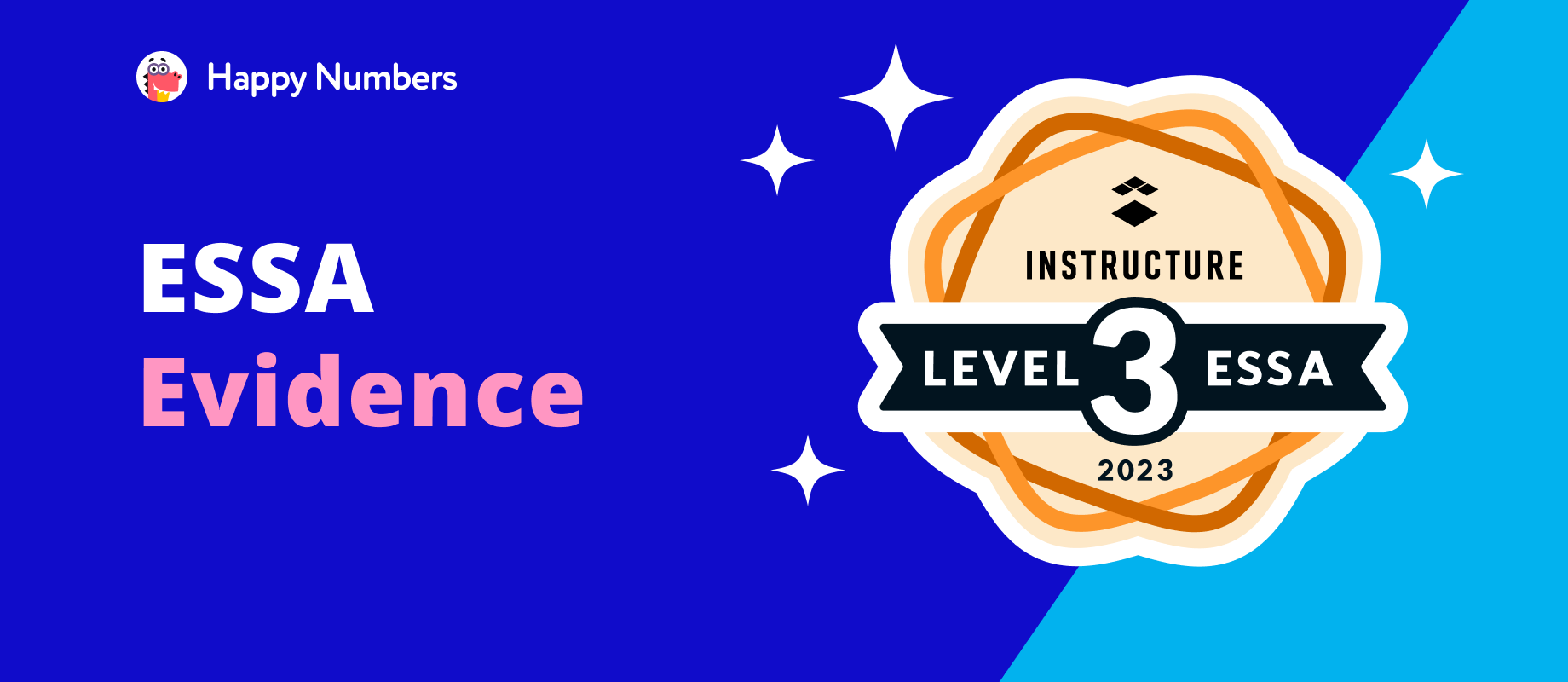The Happy Numbers program is research-based and meets the evidence standards outlined in the Every Student Succeeds Act (ESSA), specifically aligning with Tier 3 'Promising Evidence.' A study conducted in 2023 examined the results of kindergarten and grade 1 students from the previous school year (2021-2022) and found a positive and statistically significant relationship between Happy Numbers usage and end-of-year math scores. Click to see the Happy Numbers ESSA Tier III research highlights and the full report.