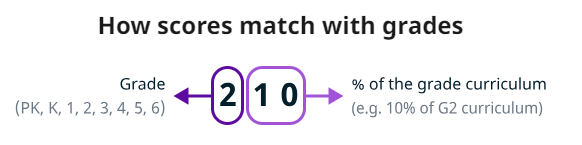 Each student receives a score as a result of the Happy Numbers assessment, where the first letter or digit represents the grade level, and the subsequent two digits indicate the percentage of the curriculum mastered at that level.