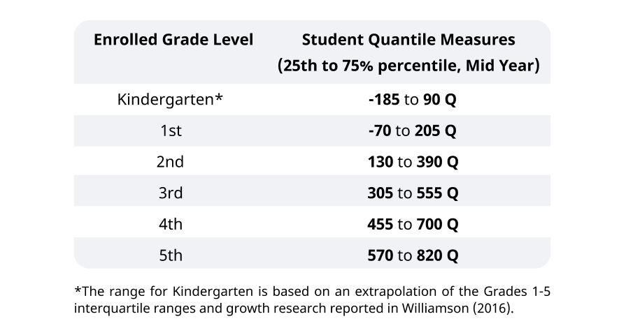 Quantile® measures help educators and parents track student growth in mathematics over time, regardless of grade level, so they do not translate specifically to grade levels. Based on research conducted by MetaMetrics®, the chart below provides ranges for typical student performance at a particular grade level. These ranges reflect the middle 50% of student performance within a grade level. These Quantile® measures do not imply grade-level expectations.
