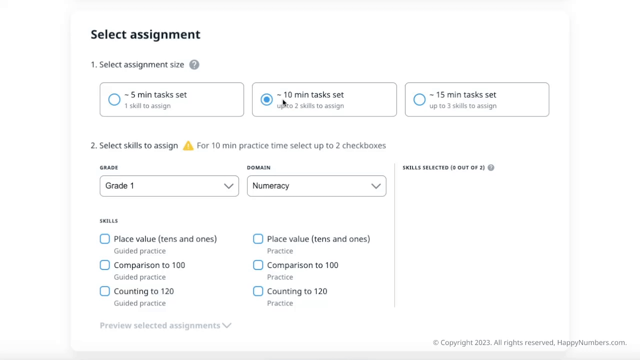 The first step in utilizing the Assignment feature is choosing the appropriate duration for the assignment. We offer three options for grades K to 2: a quick 5-minute task set, a moderate 10-minute task set with up to two skills to assign, and a more comprehensive 15-minute task set with up to three skills to assign.