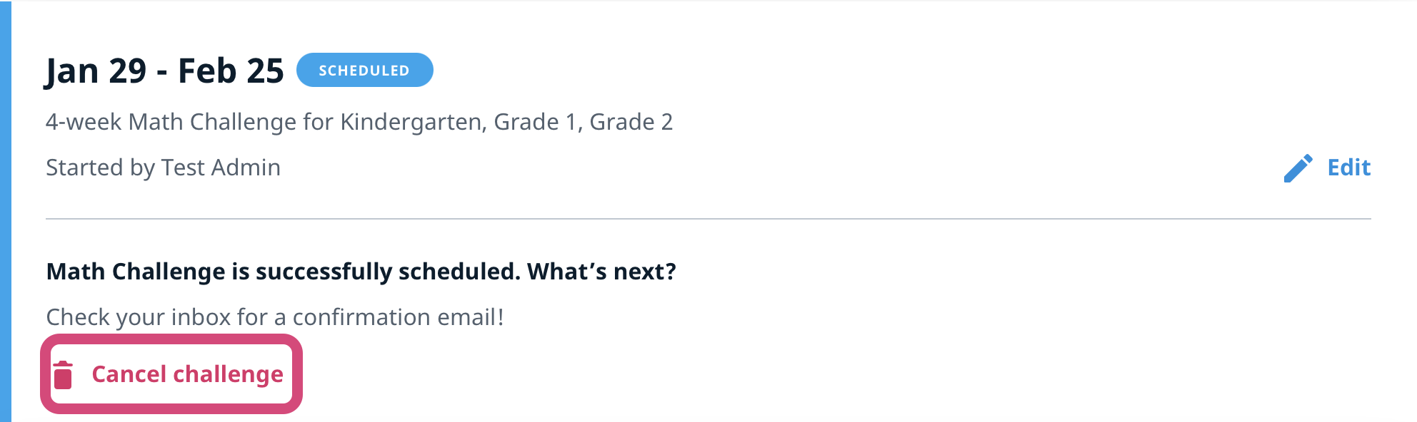 The "Scheduled" status indicates the Math Challenge is set up but has yet to begin. In this phase, you can add more participating grades to the challenge. However, the grade levels that are already selected cannot be deleted, and the starting week is fixed and cannot be edited or deleted either.