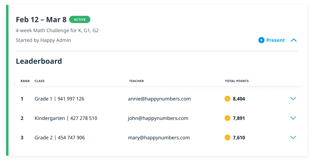 Happy Numbers keeps all participants, including administrators and teachers, updated throughout the challenge.