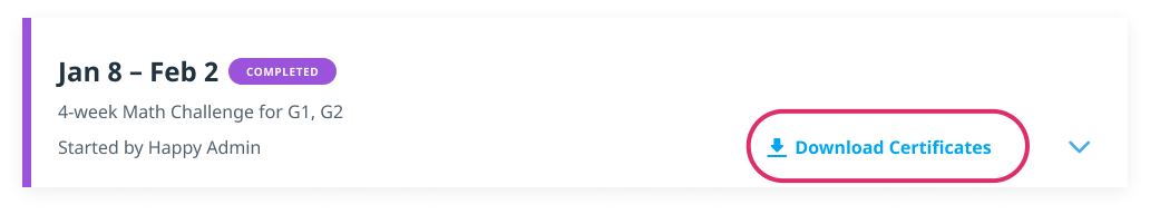 The final results become accessible once the challenge wraps up and reaches the "Completed" status. A "Download Certificates" button allows administrators and teachers to download certificates. Administrators can upload PDFs for classes and teachers, and teachers can do the same for their students.