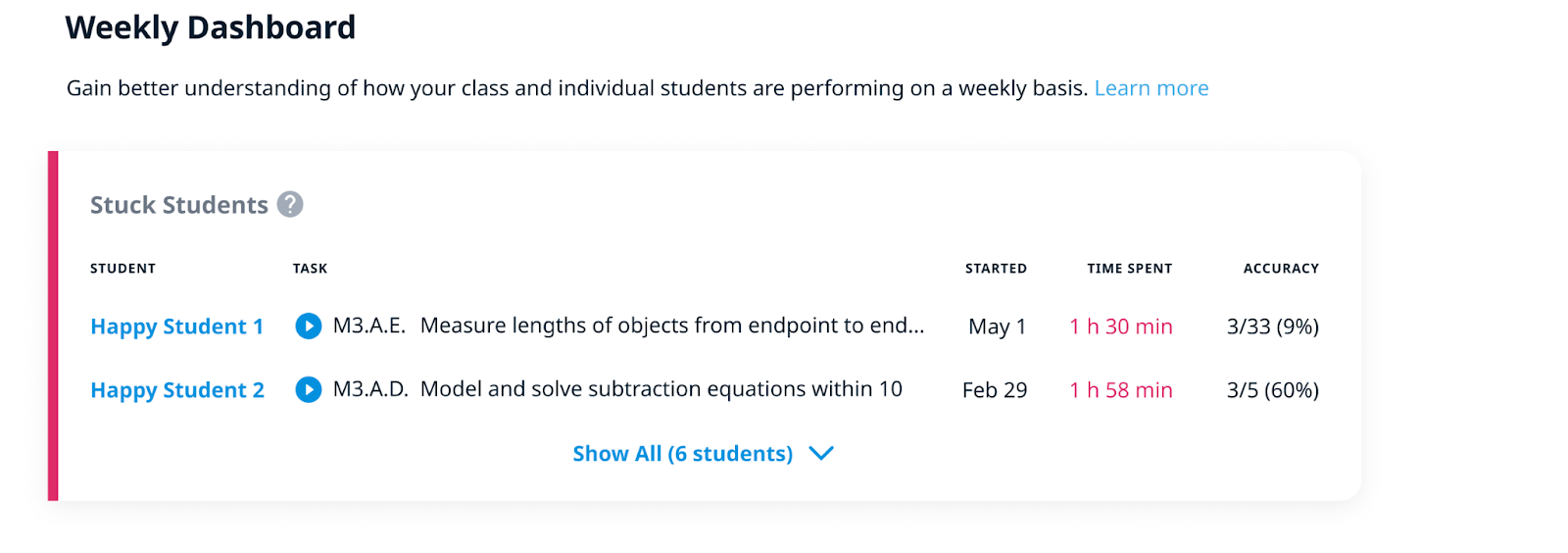 The "Stuck Students" block on the Weekly Dashboard displays, in real time, students who have spent significantly more time than expected on a current task and still haven't completed it. This feature allows teachers to quickly identify and assist students who might be struggling.