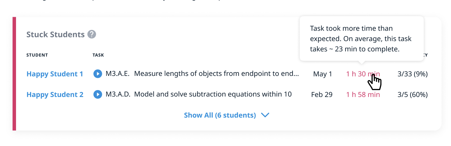 We also provide an intervention alert to highlight students who have struggled with accuracy in one or more tasks this week. You can find more information in this article.