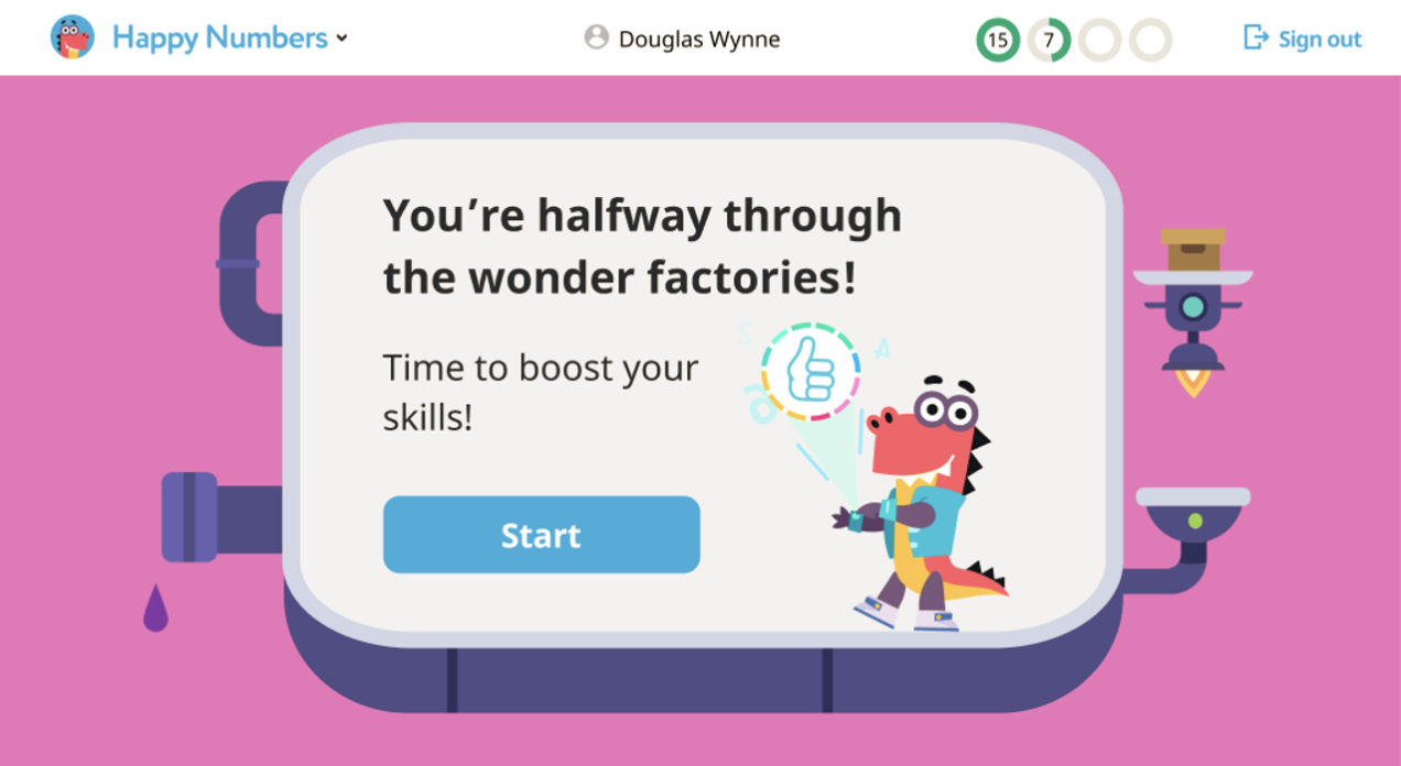 The amount of feedback and scaffolding depends on how much a student struggles with the task. A student doesn’t stay one-on-one with his or her misunderstanding. Happy Numbers will provide a comment, a hint, or additional animation to support the student. If this is not enough, we will simplify the problem by dividing it into several steps and move through the solution together.