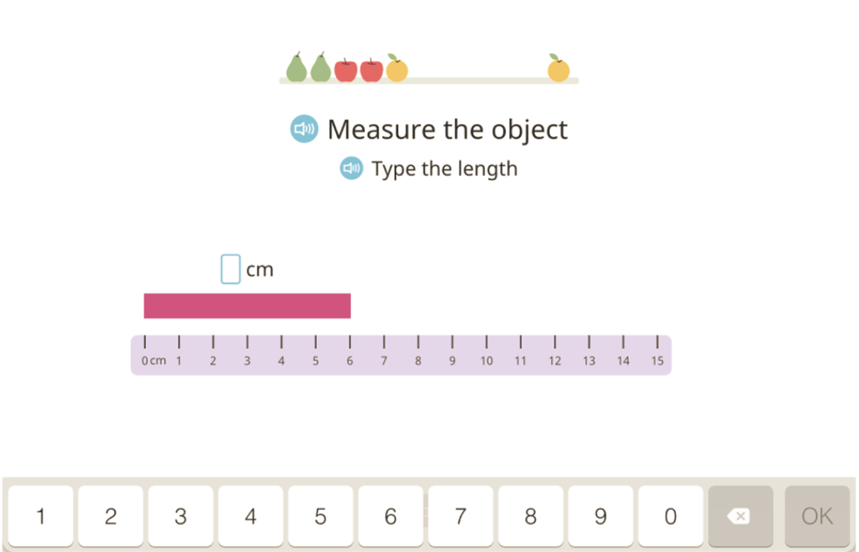 To ensure that a student moves on to the next concept only after he or she has mastered the previous one, Happy Numbers uses a clear and visual scoring system. As shown below, there are green beads (or fruits) at the top of the screen for every task. When a student enters a correct response, one green bead moves from left to right on the counter. If a student enters an incorrect response, one bead moves from the right back to the left. The goal is to move all the beads from the left to the right to advance to the next task. Therefore, a visual scoring system helps adapt the number of problems a student must solve correctly to show mastery.