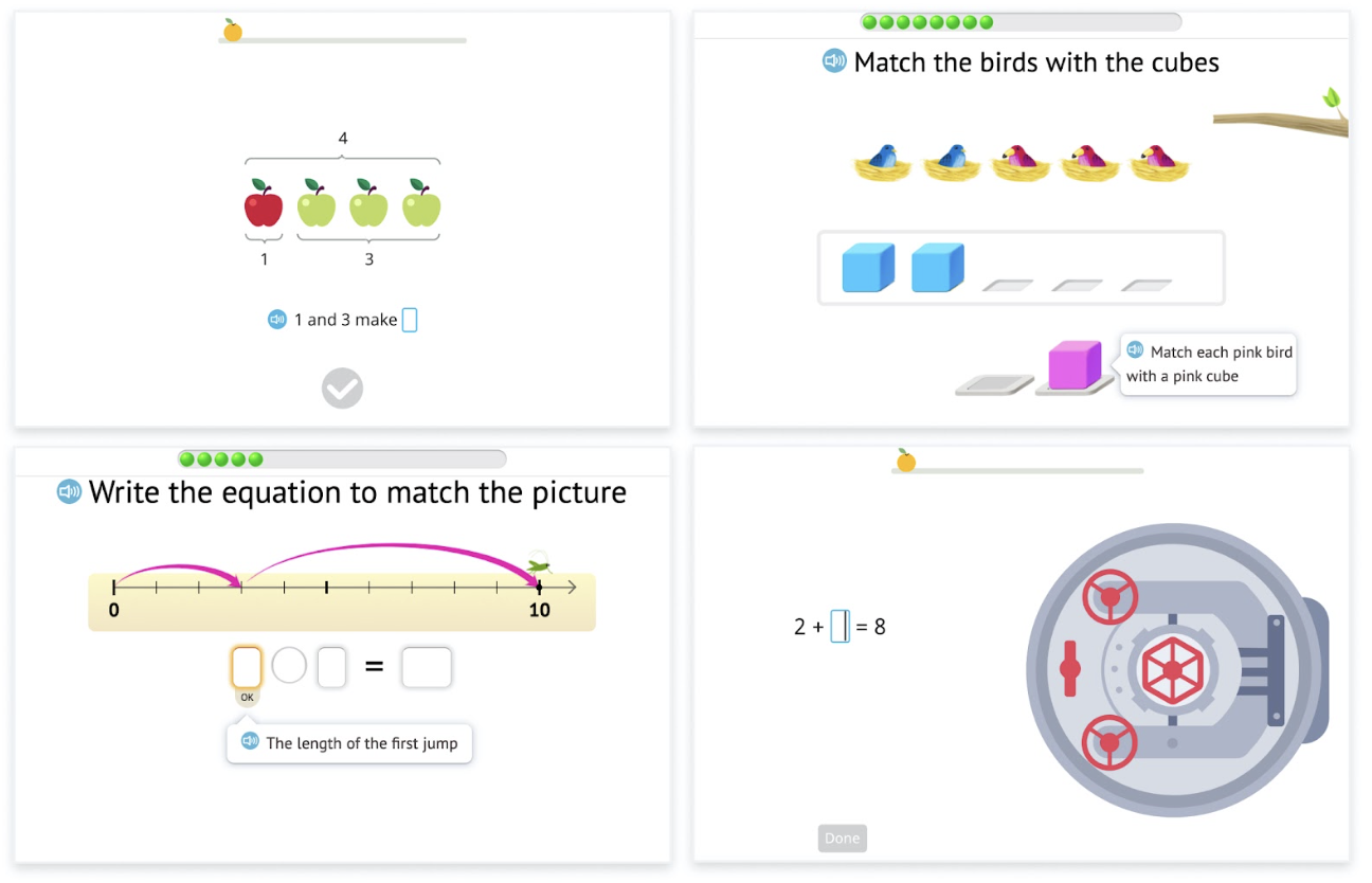 For students who can’t read fluently yet, the text might prevent them from success even if the math concept is reachable. For such students, a natural human voiceover is available on all PK-5 tasks in Happy Numbers.