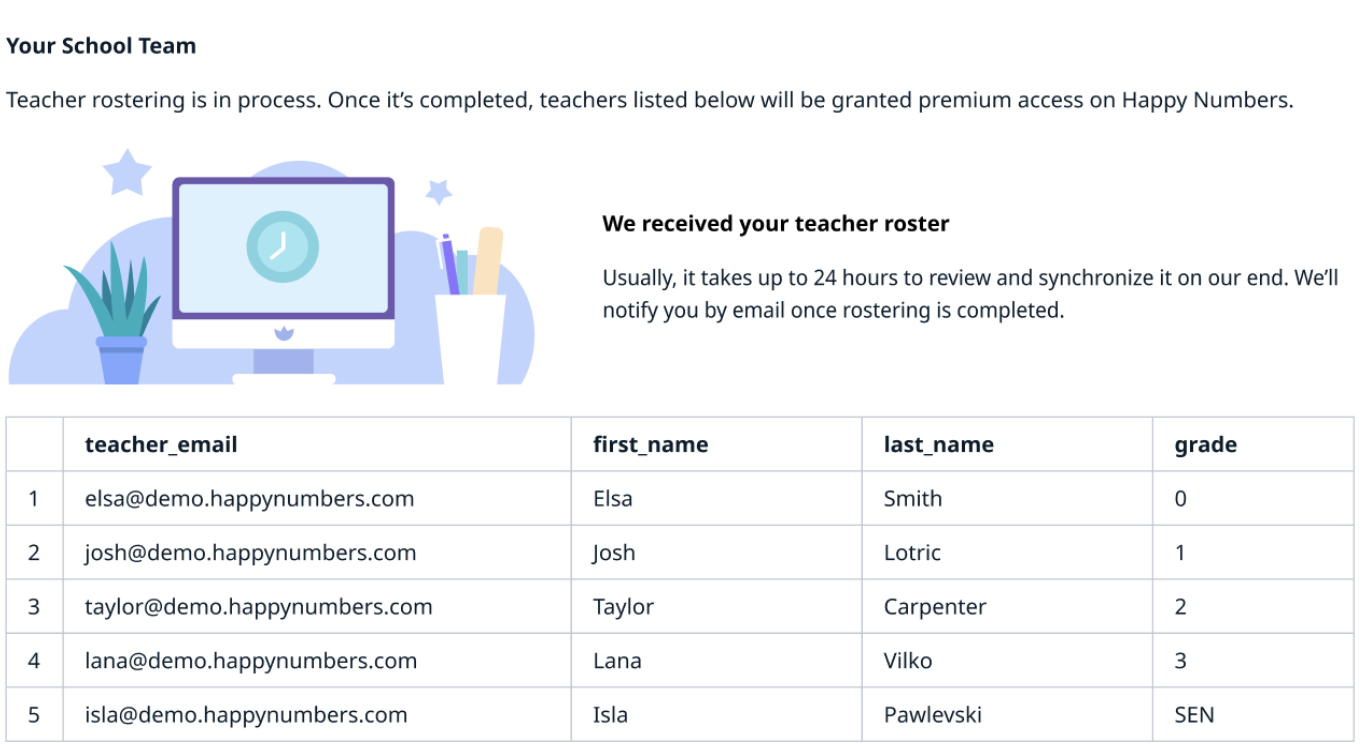 Once you confirm your roster, our Happy Numbers team will review it to grant access to your teachers. This process typically takes up to 24 hours.
