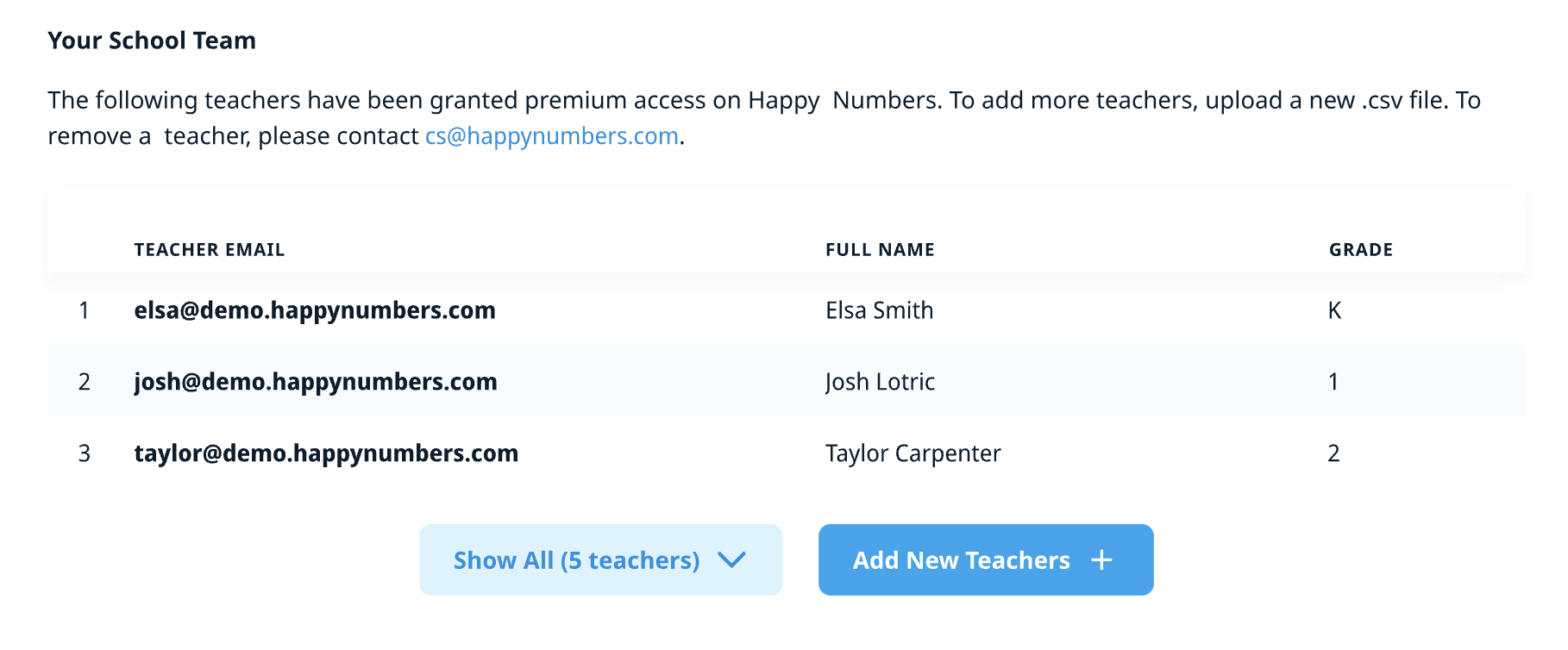 If you need to remove a teacher from your Happy Numbers school team, please contact our support team at cs@happynumbers.com.