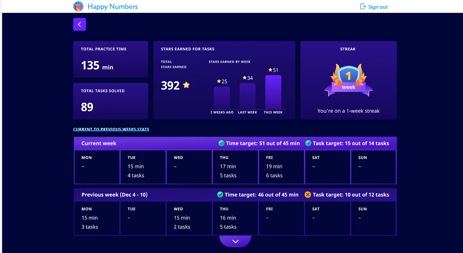 The Previous week section provides similar data but focuses on the previous week, allowing students to compare their current progress with past performance. It displays time and task targets for the previous week, along with the same checkmark or in-progress circle to show whether the targets were met.