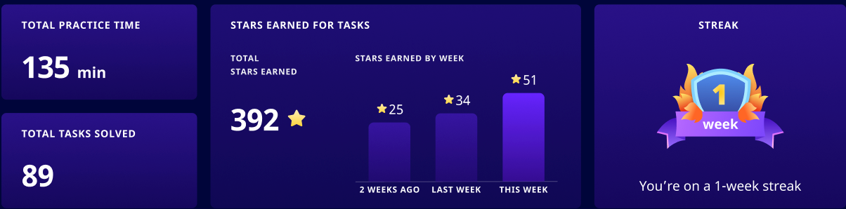 Streak: Each week, students earn a streak by completing both their time and task targets. After meeting these goals each week to extend their streak, students will earn a new badge every 5 weeks, motivating them to keep making progress.