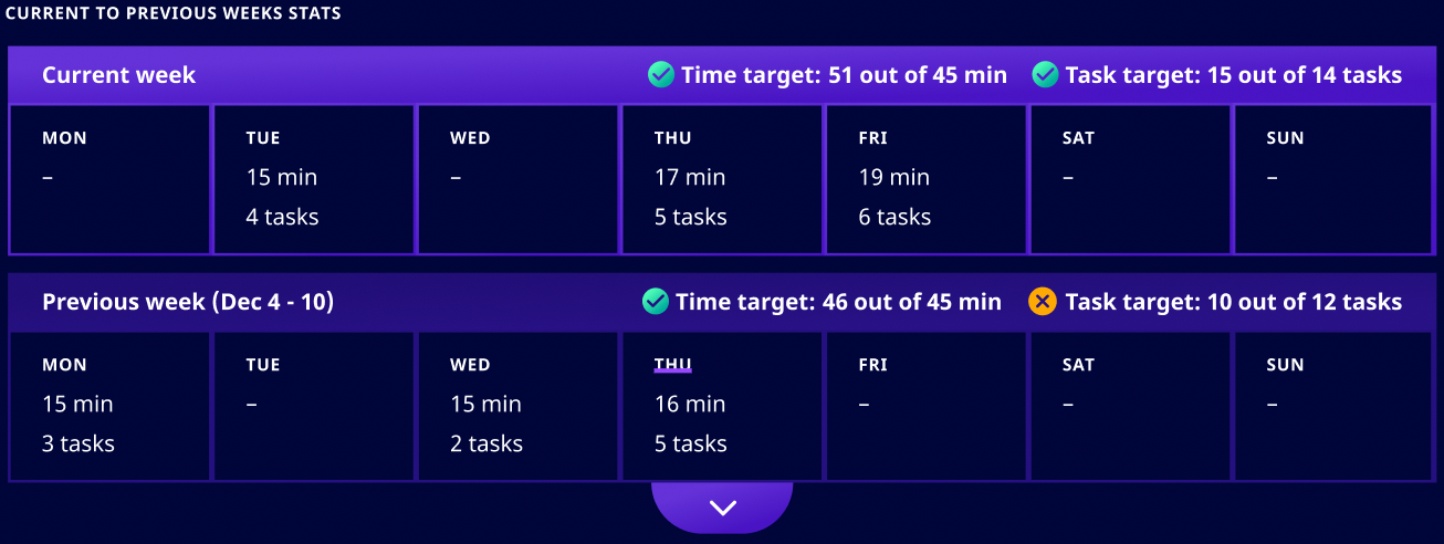 Clicking the downward arrow button expands the view, allowing students to see statistics for all previous weeks in the current month and view more of their past performance.