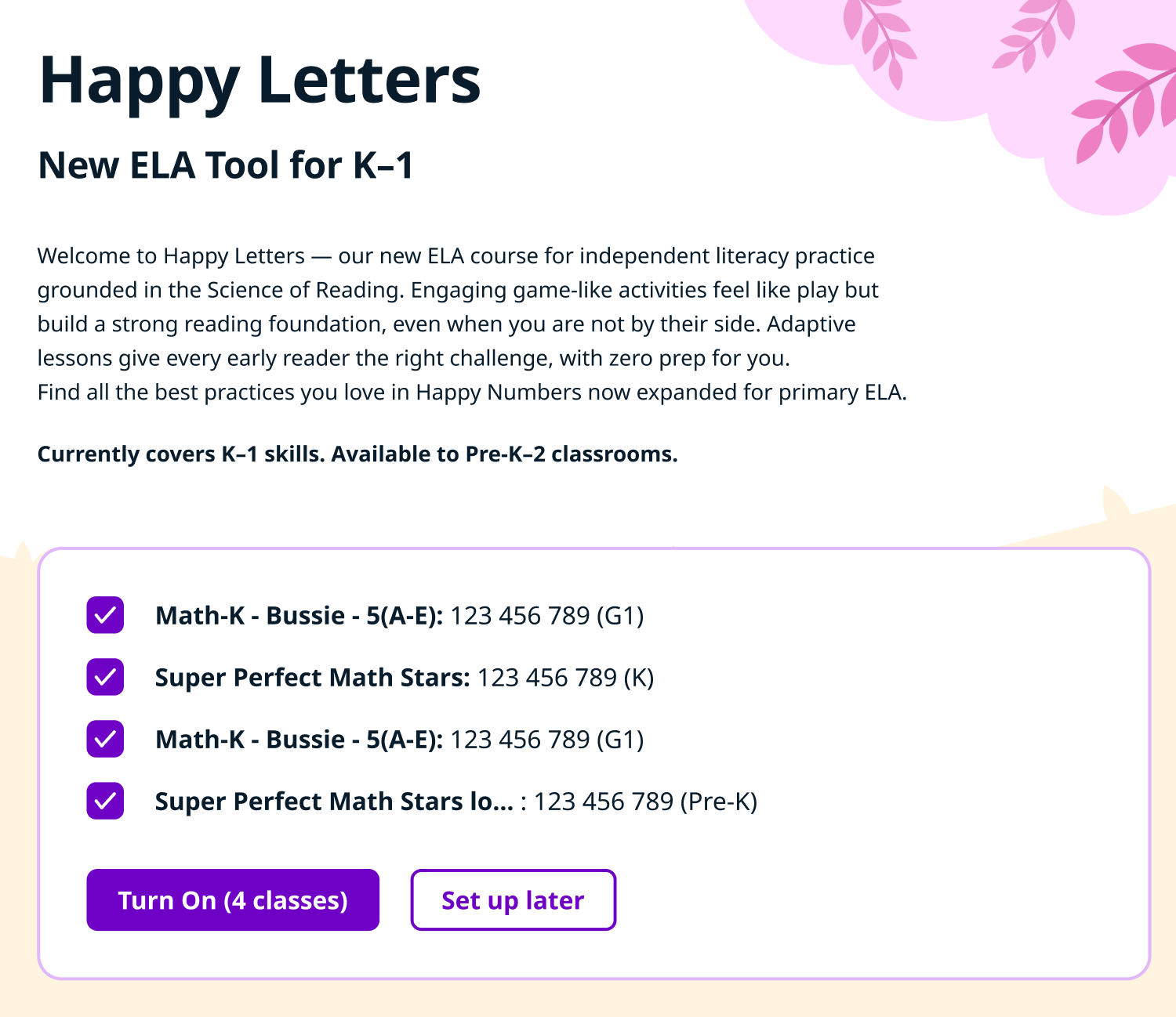 Clicking to ELA, you get to the ELA setup page. You can select which classes will have access to Happy Letters.