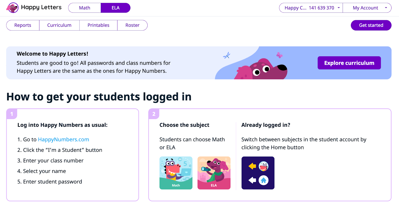 Once you turn on Happy Letters, your students can choose Happy Letters after logging in and start learning right away! All passwords and class numbers for Happy Letters are he same as the ones for Happy Numbers.